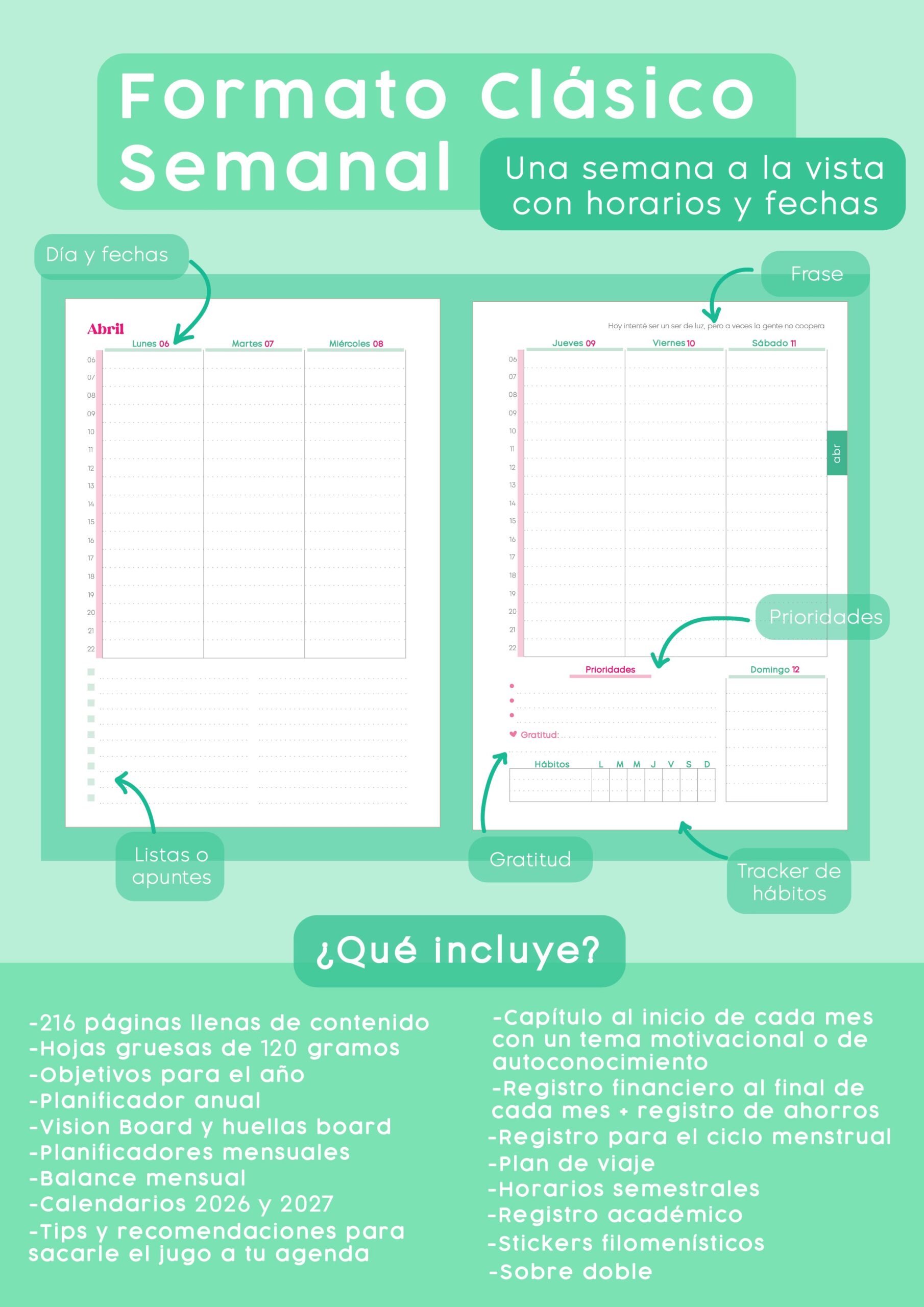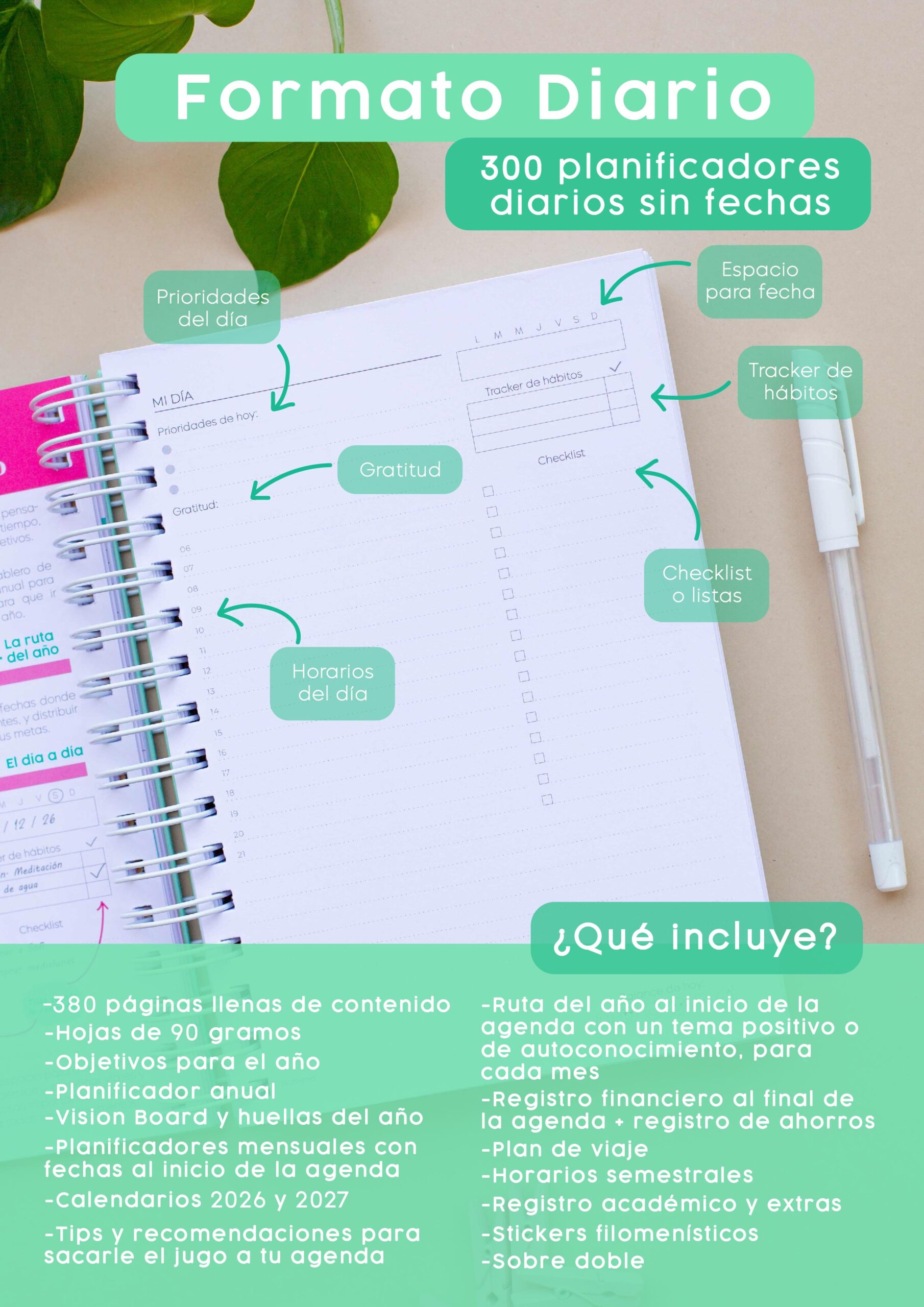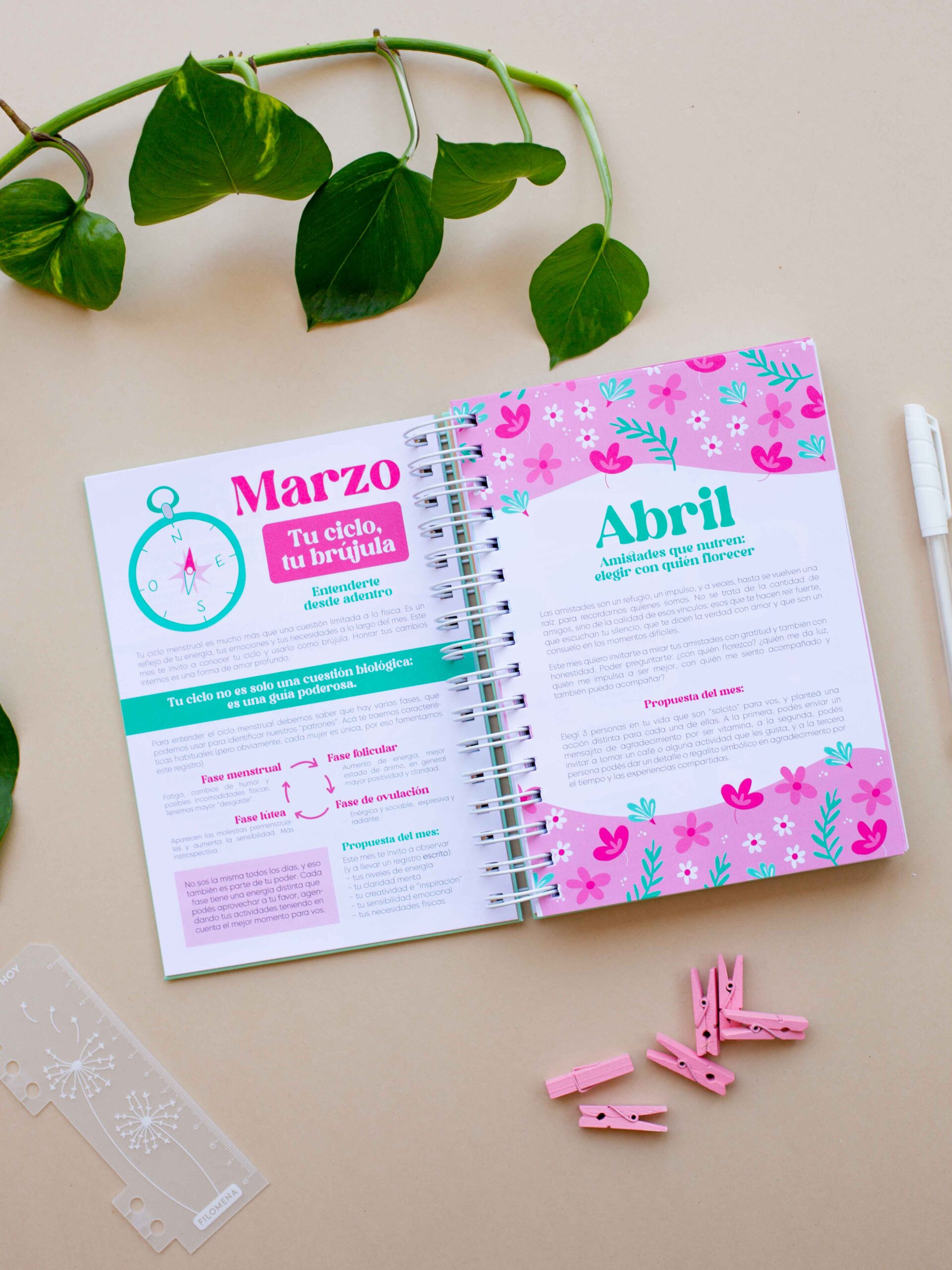 Esta agenda está creada con muchísimo amor para mujeres increíbles como vos. Está diseñada con un sistema de organización especial para ayudarte a encontrar el balance y conectar con tus metas, conocerte todavía más y tener un día a día más equilibrado. Viene en tamaño A5 y dos formatos interiores.